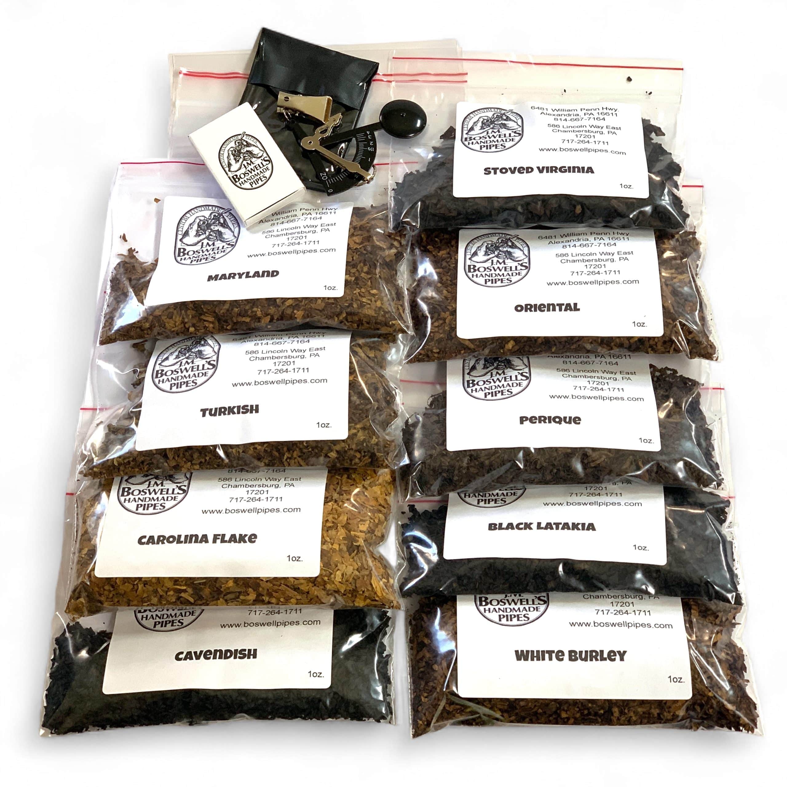 1 ounce each of BLACK LATAKA, CAROLINA FLAKE, MARYLAND, ORIENTAL, PERIQUE, CAVENDISH, STOVED VIRGINIA, WHITE BURLEY AND TURKISH.